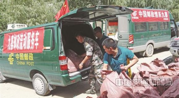 圖為漳扎郵政支局工作人員為災區(qū)群眾收寄包裹。